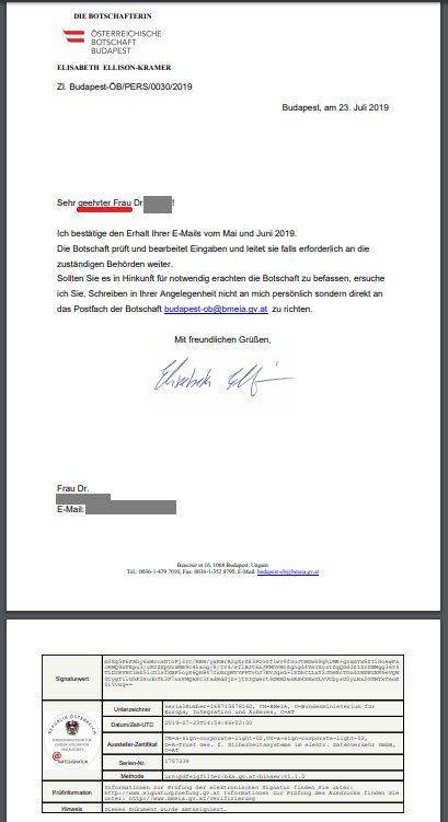 Ich möchte mich über diesen Fall in dieser öffentlichen Form erkundigen, da in Ihrem beigelegten Schreiben (ÖB/PERS/0030/2019 vom 23. 07. 2019) es keinerlei Auskunft darüber gibt, in welcher Frist und durch welche zuständigen Stellen mit der Erledigung zu rechnen ist und mit mir in diesem, meine auch die österreichische Staatsangehörigkeit besitzende Kinder betreffenden, dringenden Fall keinerlei Kontakt aufgenommen wurde.