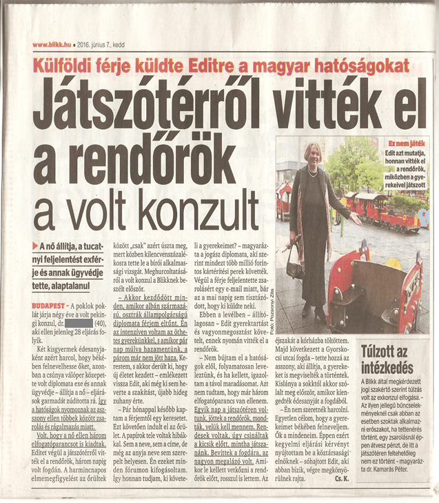 Es kam vor, dass gegen sie drei Fahndungsbefehle ausgegeben wurden. Edit wurde letztendlich von dem Spielplatz durch die Polizei abgeliefert, sie war 3 Tage festgenommen. Die 30 tägige Geisteszustandsbeobachtung unter den Geisteskranken hat ihr „nur“ deswegen entgangen, weil sie inzwischen die richterliche Eignungsprüfung mit 90 % bestanden hat. Über das von ihr erlittene Diffamieren spricht die Ex-Konsulin zuerst dem Blikk.