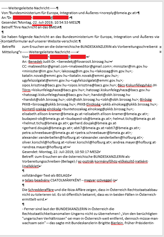 Als Beilage zu diesem Blogbeitrag lege ich die Empfangsbestätigung des BMEIA über meine Erkundigung vom 22. 07. 2019 bei, nach der endlich am 23. 07. 2019 eine (zwar sehr unprofessionelle) Rückmeldung von Ihnen – nach etwa 3 Jahren! – doch eingetroffen ist. Bis zum 23. 07. 2019 gab es – trotz gesetzlicher Pflicht (siehe AVG § 6) und trotz vielfacher Urgierungen und Erkundigungen meinerseits – keinerlei Bearbeitung meines Ersuchens vom 22. 06. 2016 an den damaligen Missionschef der Österreichischen Botschaft Budapest. In meinem Ersuchen musste ich auf die öffentlich zugänglichen Informationen über die Schredderaffäre, die Ibiza Affäre und die diesbezüglichen Ermittlungen hinweisen. Ich musste die vor den Rechtsstaatlichkeitsanomalien Ungarns warnenden Aussagen der damaligen österreichischen Bundeskanzlerin und die Wichtigkeit der Zuversicht und Bürgernähe betonenden Anmerkungen des österreichischen Staatsoberhaupts und des damaligen EPP Fraktionsvorsitzenden zitieren und ich musste – als gesetzekonforme Rechtsdurchsetzung – in Aussicht stellen, die Problematik auf EU Ebene zu thematisieren.
