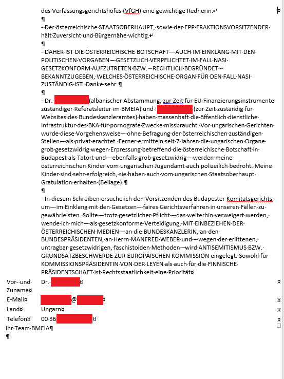 – Die Botschaft hat den Ruhm Österreichs zu schützen und es ist äußerst unangenehm, dass diese grundlegendsten Grundsätze – als gesetzekonforme Rechtsdurchsetzung – wegen der gesetzwidrigen, dokumentierten Rechtsverweigerung der Österreichischen Botschaft in Budapest in diesem Fall breit öffentlich kommuniziert werden müssen. Ich will meine Mädchenvermögenwohnung nicht verlieren und ich möchte nicht ins Gefängnis geraten, damit die zwei vor Ihnen auch bekannten österreichischen Bediensteten – grob gesetzwidrig – ihr öffentlich dienstlichen Porno gefällig betreiben können, daher werde ich mit allen notwendigen gesetzekonformen Mittel dagegen auftreten.