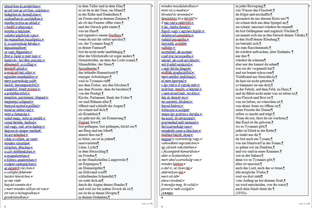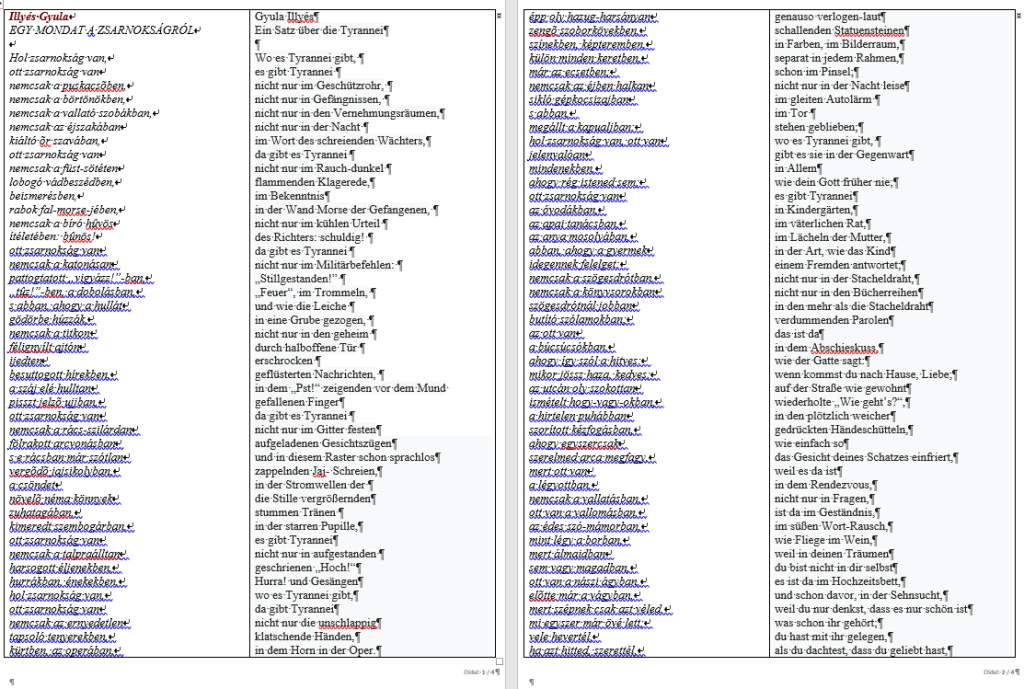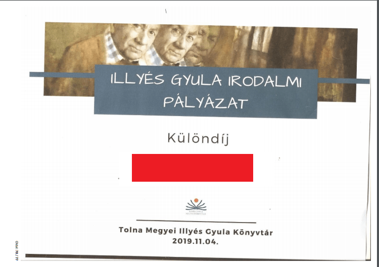 Da dieses Gedicht in der Schule analysiert war und gerade dann wir es aus Deutsch üben sollten, wie das Wörterbuch zu benutzen, haben wir es aus diesem Anlass versucht, dieses berühmte ungarische Gedich zu übersetzen, mit der wir den Sonderpreis des Wettbewerbs gewonnen haben. Unsere Übersetzung wurde an der Preisverleihung von Schauspielerin der Deutschen Bühne Ungarns, Cathrein Unger vorgelesen (https://www.teol.hu/kultura/helyi-kultura/illyes-gyulara-emlekeztek-a-konyvtarban-1975491/).