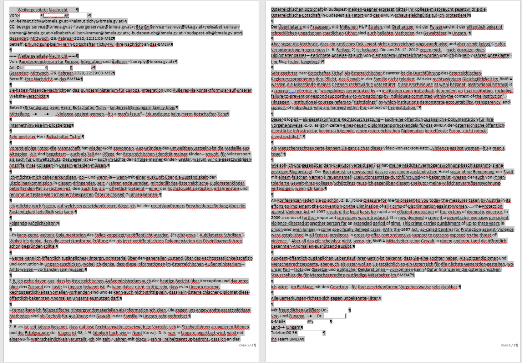 Dieser Blog ist – als gesetzkonforme Rechtsdurchsetzung – auch eine öffentlich zugängliche Dokumentation für Ihre Vorgehensweise. Z. B. es ist in Zeiten eines neuen Diplomatenpornoskandals (https://index.hu/english/2020/02/10/peru_hungarian_ambassador_child_pornography_gabor_kaleta/, https://index.hu/english/2020/02/11/gabor_kaleta_child_pornography_us_authorities_hungary_peru_ambassador/) für das BMEIA der österreichische öffentlich dienstliche Infrastruktur beeinträchtigende, einen österreichischen Diplomaten betreffende Porno „nicht primär dienstrechtlich“.
